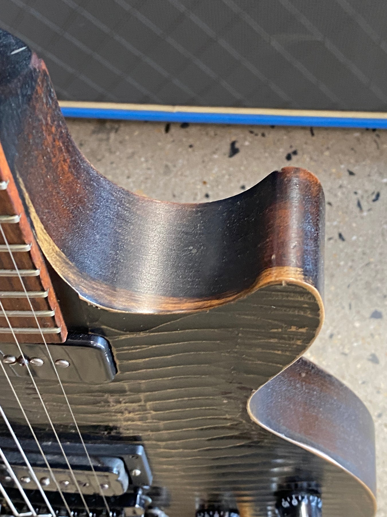 • Finish: Distressed, satin nitrocellulose finish, giving it a "barely finished" look, with no binding on the body or neck.